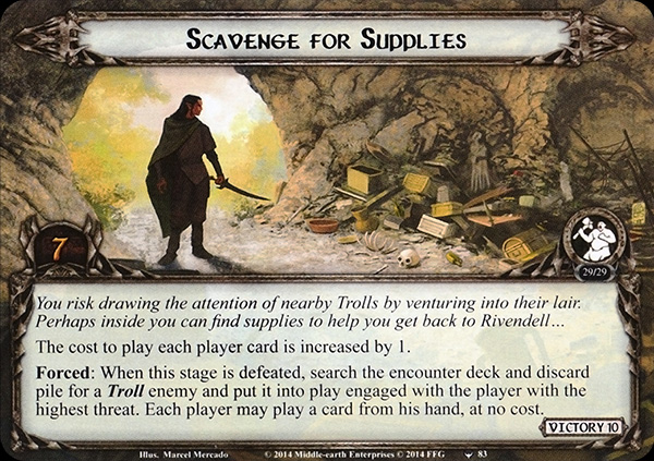 My next 2 attempts went better, also thanks to starting both times with Scavenge the Supplies as the first sidequest. While more expensive cards are annoying, it’s more manageable for a mono-sphere deck than the damage. I turtled on this and slowly got my allies out (once even exploring Scout Ahead first) until I was ready to deal with the Troll that engaged me when exploring the sidequest. The other good thing about this strategy was that there were now multiple safe locations in the staging area that would help me during stages 2 and 3. Then I wouldn’t have to reveal extra encounter cards or have my characters lose willpower. Between my allies, Thurindir’s, and Rossiel’s boosts, I had enough willpower to race through these stages rather quickly, and with a Halfling Bounder canceling an Arador’s Bane, I once didn’t have any combat aside from a wimpy Goblin Pursuer engaging me. During the other run, I had to engage some bigger enemies because my threat got too high, but with Rossiel being set up, I could block them until I made it out of the Ettenmoors.