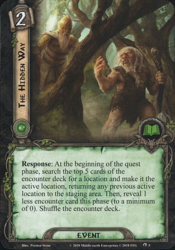 While losing mainly to a bad combination of encounter cards, I really wanted a 3 out of 3 win rate against this quest. While the core of the deck worked, I found there still to be some room for improvements. Mainly I wanted to include two cards I overlooked in the first place. Mithrandirs Advice is an awesome draw card I simply forgot about because I don’t play mono-Lore decks that often. The other one is The Hidden Way because locations never were big trouble during my first playthroughs, and I rather don’t reveal enemies or treacheries. I’m not sure if you can grab Safe Locations with it, so I won’t do that cause it seems to break the quest, but it still seems absolutely worth it.