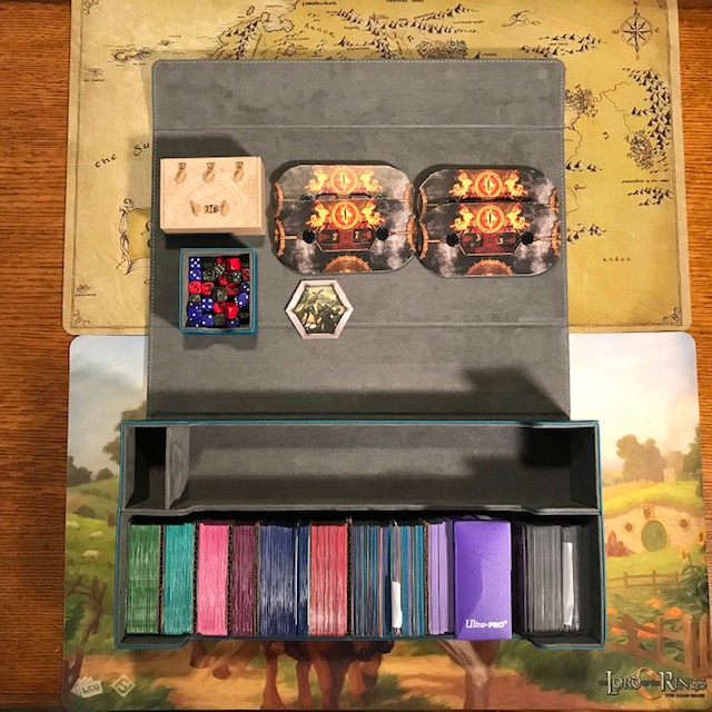 The one thing in my collection I did spend some money on (aside from the obvious…the cards) is my box that holds my “many decks of many colors,” some dice, threat counters, and 3 playmats. I store these sometimes mangled and mixed decks into a turquoise Superhive 550+ XenoSkin box. Along with the three playmats I have, 27 small 6 sided dice in 3 different colors that I use in place of tokens, green for progress, blue for resources, and red for damage. I also have my 2020 COTR swag threat counter, custom metal d20, and my standard threat counters from two core sets.