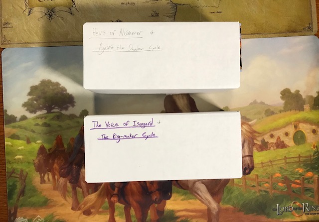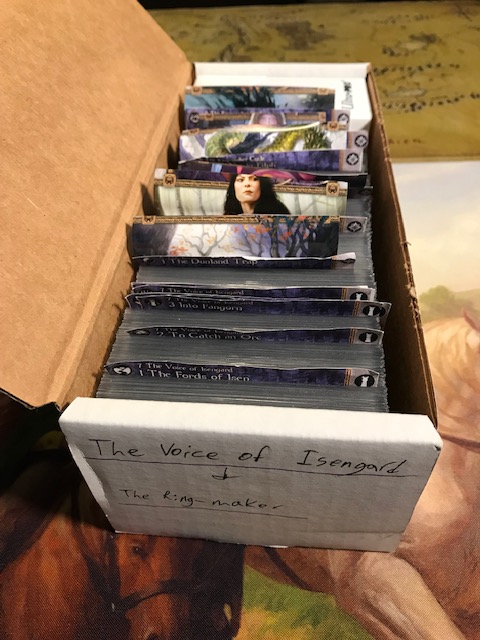Here is the link to his article about his many decks of many colors and building multiple decks if you want to know more. And a link to the storage article. Also, Shelin just uploaded 18 decks with no proxies onto RingsDB.