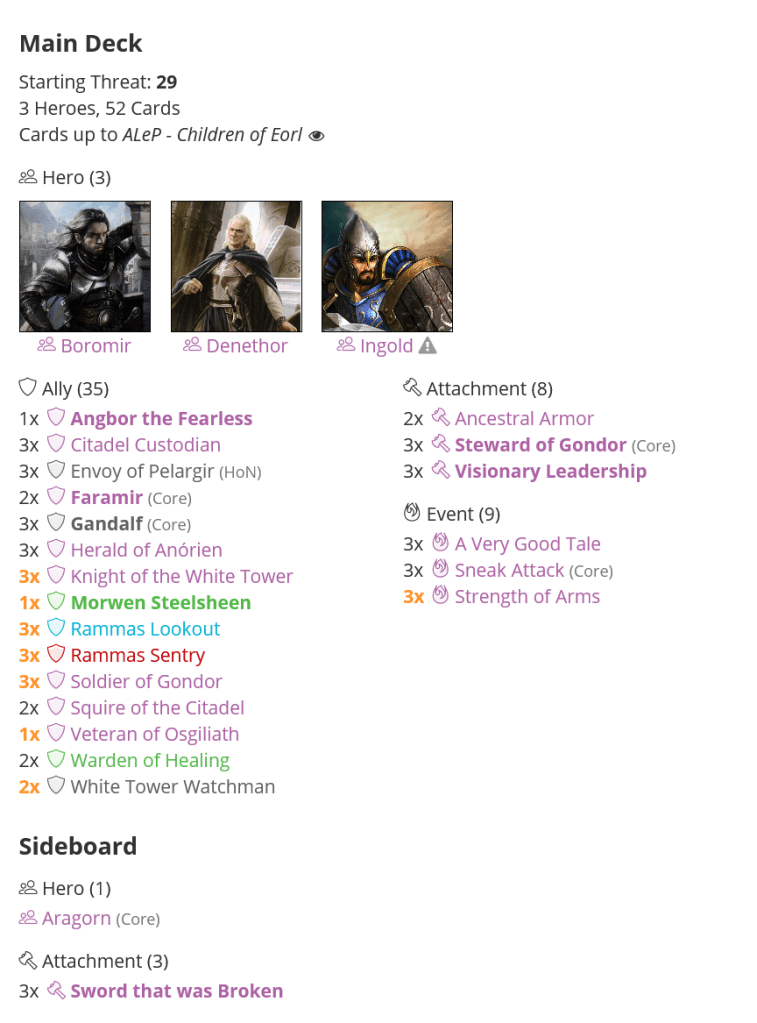 As always, it is time for my suggested deck. I’ll follow the same principle as I did with my previous articles and show you a fun deck to play with. This deck isn’t meant to totally destroy this scenario because it doesn’t follow all the previous tips and tricks. On the other hand, it is definitely fun in Massing at Osgiliath, so I highly recommend giving it a try. The deck I chose to show you for this scenario isn’t mine. It is made from TheChad via RingsDB, so if you like it, please give him a like for his amazing work. This deck is a mono leadership swarm Gondor deck that includes cards from the ALeP project.