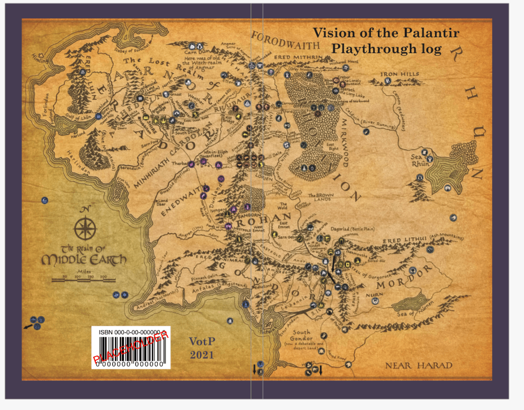 With all of these ideas taking shape, I began prototyping the book in March. I used software from one of the studios where I could have the books printed. The software was free and didn’t require my limited knowledge of Photoshop to use. While the first draft was pretty rough, the book was functional in my eyes, and thus I continued to explore ways to improve the book. One of the first things I wanted to use external help for was the cover. Not only did I want the cover to look nice, but it should also be sort of functional. As such, I approached Beorn from Hall of Beorn for his interactive map of Middle Earth, where the different quests are placed on the map. This map hadn’t been updated to include the final two cycles of the game, but after I requested the update, I was free to use the image on the books. I spread the art over the spine and both covers (front and back). Luckily, there was some space in the Bay of Belfalas for the mandatory IBSN number and barcode so that it didn’t really obstruct any notable landmarks. I also wanted to have the title be in a relatively empty space on the front cover and found a nice spot in the Northern Wastes that I could use. One downside of the map art was that the resolution wasn’t ideal for the book’s format that I chose. To ensure that the art wouldn’t look as blurry as it would if I stretched it all the way, I filled up the rest of the cover with a dark blue-purple border. This is neutral enough that the map still remains visible and allowed me not to risk losing a part of the map if I stretched it to the borders of the cover.