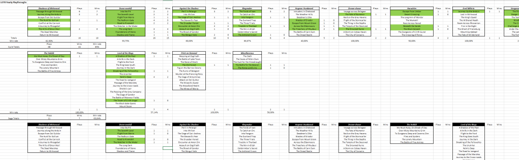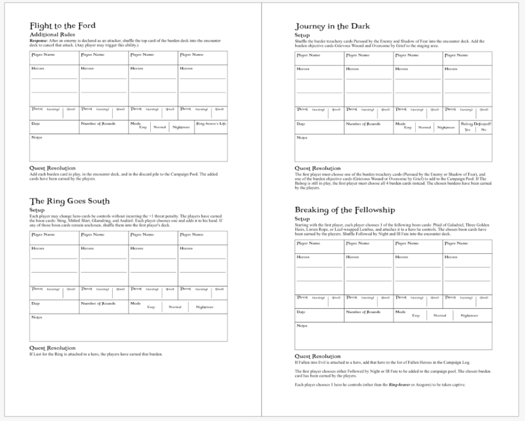 That help came in the form of Thaurdir, who does a lot of the graphical design for A long-extended Party and is one of the Valar-level supporters of the blog on Patreon. I had contacted him earlier to make a collection log for the book. But thanks to AleP and his work requiring a lot of time, it wasn’t finished for the first prototype. Luckily, we got together in August online to get most of the work done. Almost all pages got a redesign, with better-looking font and nicer spacing for the grids than I could get for them in MS Excel. The campaign log especially got a decent upgrade, where encounter set icons replaced my previous wall of text. All of this work did mean that some parts of the book now stretched more pages than the initial prototype. Since I wanted to keep the book at 96 pages, I opted to remove a few pages of the playthrough section.