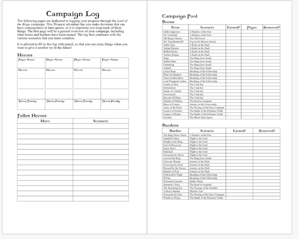 • Page 14-15: Campaign overview and list of Boons and Burdens earned