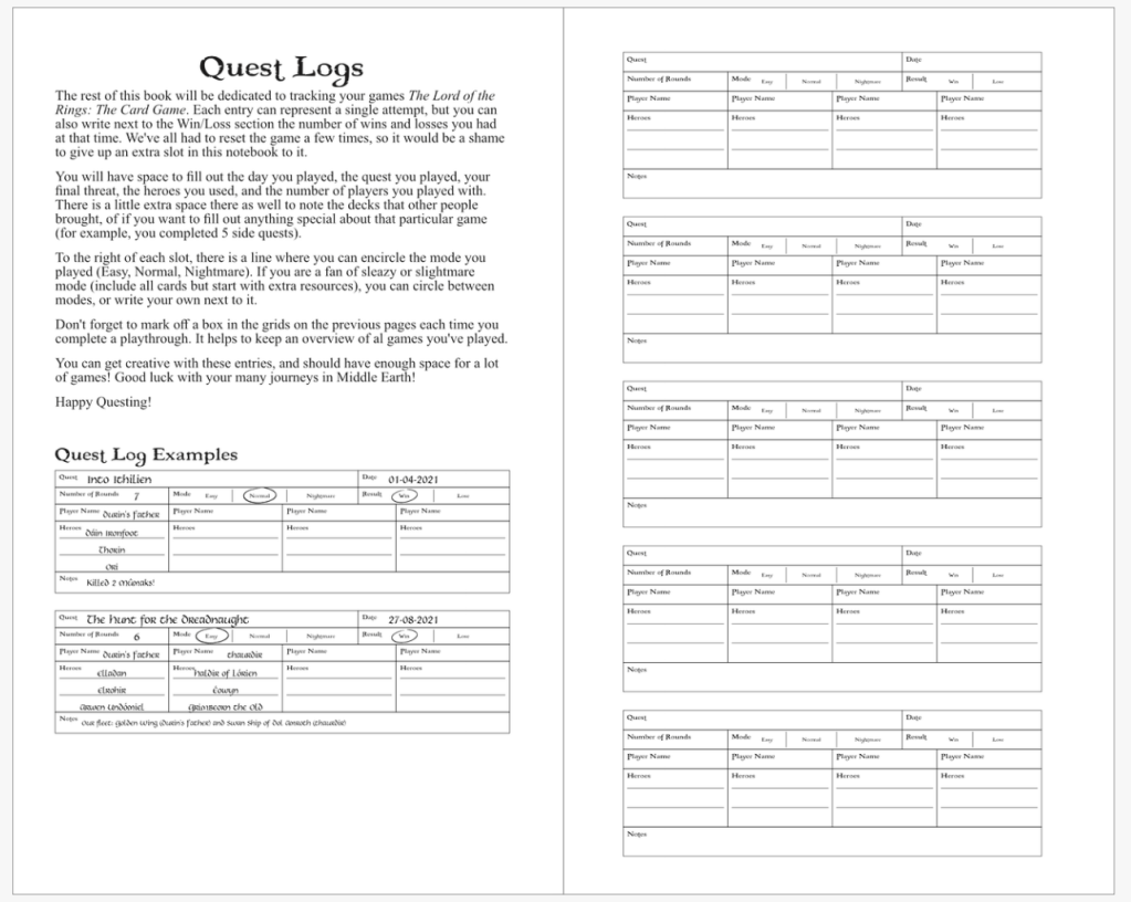 It arrived a few days later, a few days earlier than expected. The book’s quality was nice, especially the glossy cover and the paper used for the book. This isn’t that regular notebook paper that tears easily. I found a few mistakes soon after using the book, mainly concerning spacing for the playthrough logs. I tend to have small handwriting, and even I could barely fit the name of a quest on the pages. There were also other errors, like me straight-up forgetting to add Lothiriel to the list of heroes in the book… So with all that done, it was time to go for the second revision of the book and get some more help.