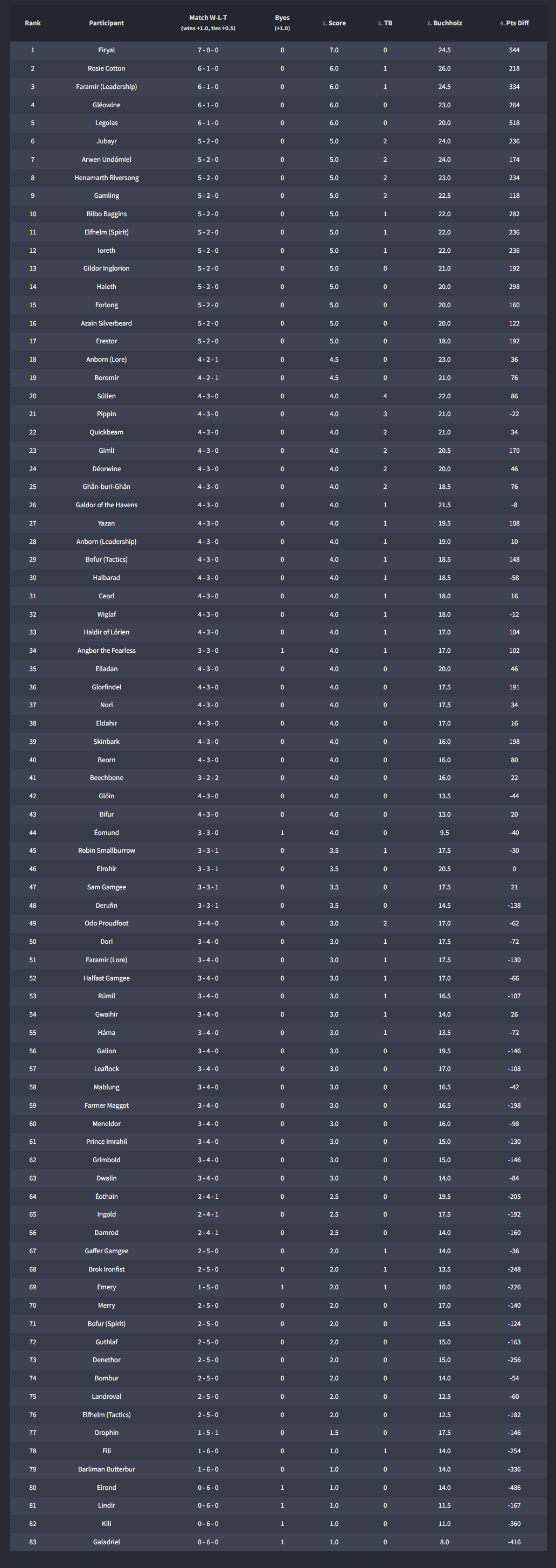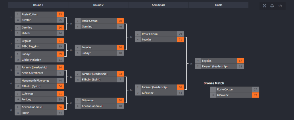 In the semi-finals, Rosie Cotton (29-71) and Gléowine (14-86) lost their respective matches against Legolas and Faramir. This made them duke it out in the loser’s final, which determined the fourth and fifth place, as Firyal was already deemed the winner of the event. During this match, it was Gléowine that was victorious. He beat Rosie quite unexpectedly by a decently wide margin. Rosie is, of course, a bit locked into the Hobbit archetype, but I have seen what MOTK Rosie decks can do, and honestly, it is scary to see in action with how powerful it can be.