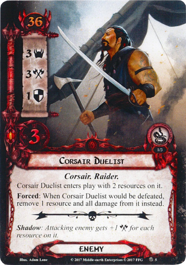 The twist on this Corsair is that he already enters play with two resources and doesn’t steal them like the other Raider enemies. Also, whenever he would be killed, you remove a resource and all damage from him instead. That means you have to kill the Duelist three times before it dies. Remember that you can only attack each enemy once per round by standard, so this process is going to take three rounds usually. Grimbeorn can safely accelerate the process at the cost of some resources.
