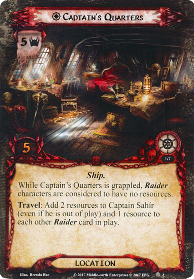 As a location that just sits in the encounter deck, Captain’s Quarters has some serious stats. Five threat and five quest points make it a terrible reveal at all times and hard to clear. While it is grappled at stage 3, Raider characters are considered to have no resources. This mainly hits the ally sides of Sahír and Na’asiyah: The former just has willpower and combat values of 0, regardless of how many resources you already put onto him, while the latter cannot spend resources to increase her relevant stats. Both of the Raider allies are hit very hard by this, so having the Quarters not grappled is important.