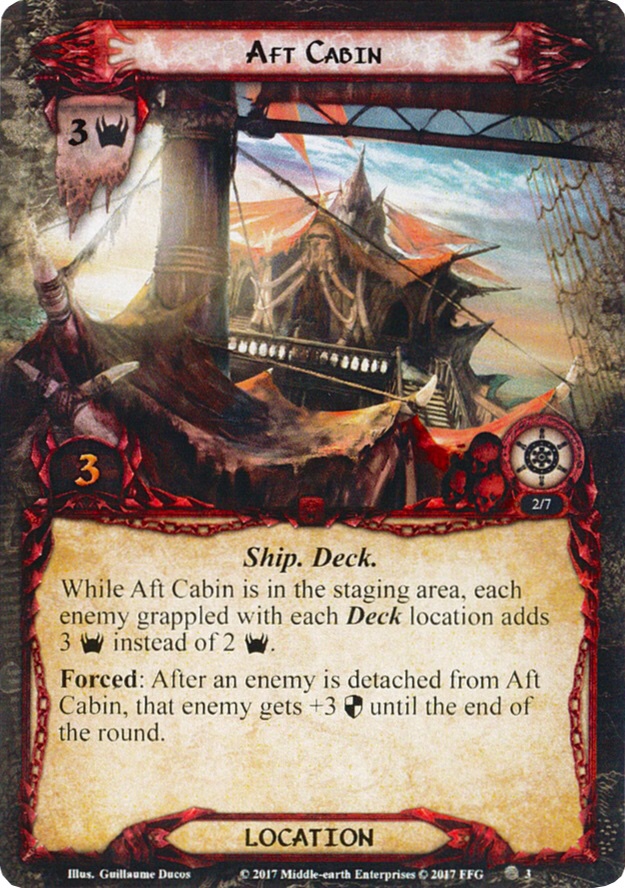 At stage 3, this essentially gains two new abilities: The first one has grappled enemies add 3 threat to their location instead of 2. Not only does this make it far easier to lose by a location having 9 threat at the end of the round, but it will also make questing much more difficult because threat in the staging area can rise very quickly. Luckily, this effect only applies if Aft Cabin is in the staging area, so when you travel to it, the effect is gone either way. Keep in mind that if you can’t clear it next round, you might need to travel to another location, returning the cabin to the staging area.