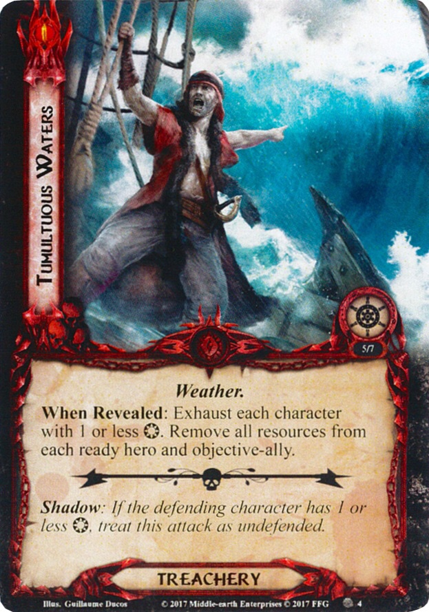 Tumultuous Waters mirrors Hold Steady!‘s effect. Exhausting all characters with one or zero willpower can be a big problem because these tend to be the more combat-focused ones like Éomer and Na’asiyah at stage 3. You will rarely have many characters with two or more willpower that are not committed to the quest, so this usually hits just the right characters to be a big problem.