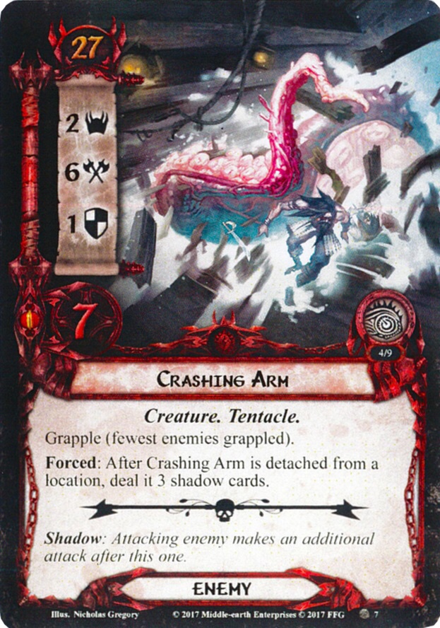 Crashing Arm also has an effect that gives it three shadow cards whenever it is detached from a location: This means that it will often attack with four shadow cards. Keep your cancellation ready for this; at an average of three shadow effects on these, you are bound to have some awful effect in there! Additionally, you really want to kill the Crashing Arm as soon as possible, so it doesn’t reattach: Too many shadow cards revealed will have a lasting impact on the board state.