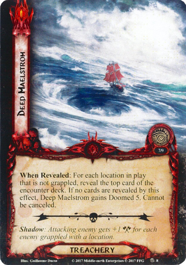 While the two enemies are both very aggressive, Deep Maelstrom gives the encounter deck a way to catch up if the players are ahead. It cannot be cancelled, which is sad because it is the only treachery card really worth cancelling.