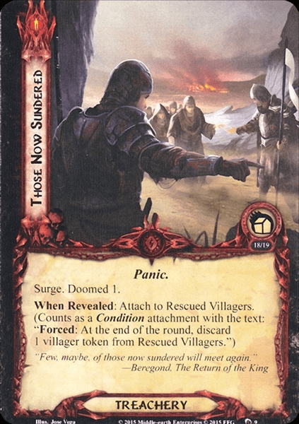 - Those Now Sundered: Finally, we have treachery that will attach itself to the Rescued Villagers objective. The card will have a condition attachment that will discard 1 villager token from Rescued Villagers at the end of each round. This constant outflow of villager tokens makes it very hard to keep increasing the number of tokens on the objective, especially if more than one copy of Those Now Sundered attaches itself to the card. You really have to bring condition removal for this card alone, as otherwise, you will find yourself with next to no villagers left by the end of the game. The treachery also doesn’t attach to the quest card, which would have allowed for some more tricks. So you are pretty much forced to bring some form of Condition removal. My suggestion would be Power of Orthanc, as the quest doesn’t punish a high threat too much. Other cards like Miner of the Iron Hills or ally Elrond also work. The treachery itself will also raise each player’s threat by 1 and surges. This is really one worth canceling if you want to avoid adding the condition removal to your deck. But with so many treacheries in this game, it will be easier to discard this as an attachment and leave the Test of Wills for the other treacheries instead.