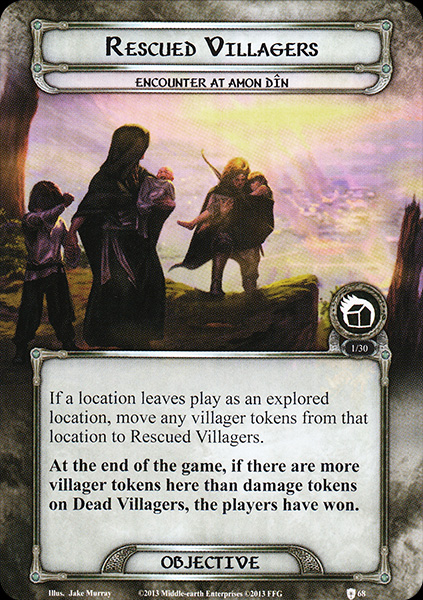 The other rule that is added to the game is a Forced effect at the beginning of every quest phase. Players must either discard 1 villager token from Rescued Villagers (and place it on Dead Villagers), or they must reveal 1 encounter card. This is a difficult choice each round, but especially during the first round. You already got a card per player during setup, will get another during staging, and now you might end up with one extra. That puts the encounter deck at a huge advantage. When playing the game with a low player count, that extra card each turn will hurt a lot. It would be better to discard the villager token instead, and the game even allows you to do that during your first round, as it gives you a free token on the objective during setup. But the decision really depends on your current boardstate and the number of alive/dead villagers at the moment. You can still rescue the villager from this effect with Lord Alcaron, so I would suggest you use him for this effect, as it saves you an extra encounter card. Players also have a tendency to forget this rule exists, so maybe set some sort of reminder for yourself. Or just keep Lord Alcaron exhausted at all times to compensate and move the villager to a location instead.