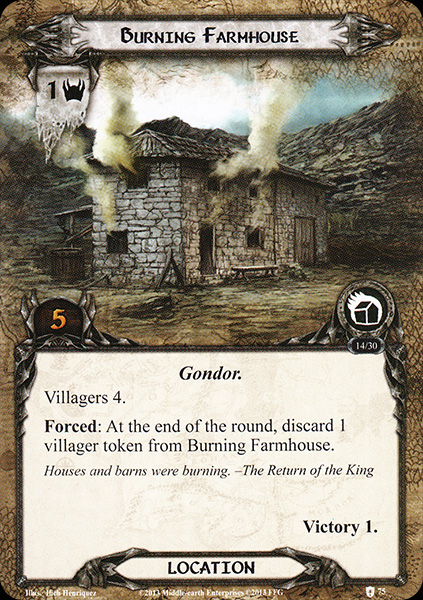 - Besieged Homestead: This is definitely the more annoying one of the two new locations. And I’m not just saying that because this location shuts down a strategy that worked well against the regular version of this quest. You could usually bring some location control to clear any locations in the staging area to claim their villagers without having to travel to each location. The Besieged Homestead comes with the wonderful ability that discards a Villager token from each location in the staging area where progress gets placed. That means that a single Northern Tracker could kill quite a lot of Villagers, making travelling to locations next to pointless since there is nobody to rescue anymore. Luckily, you only discard 1 villager for any amount of progress placed on a location in one go. So you could build up some big progress-placing cards like Mirkwood Explorer and nuke a location by the end of the game for a few more villagers, even if the Homestead is in play. That only costs 1 Dead Villager, but Lord Alcaron could also save them.
