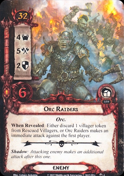 - Orc Raiders: These enemies are pretty strong compared to what got removed from the encounter deck to make this Nightmare version. I know this is common, but it’s always a bit of a shock when you see such strong enemies with horrible effects in the encounter deck. Such is the case with the Orc Raiders. They have a very powerful stat line at 4 threat, 5 attack, 2 defence, and 6 hitpoints. With an engagement cost of 32, the threat won’t stay around very long, but that initial hit of 4 threat can still cost you enough progress to not clear the active location. But the initial attack value of 5 hurts a lot more, especially because the Raiders have a when revealed effect that can cause them to attack when they are revealed! Players can prevent this initial attack by discarding a villager token from Rescued Villagers, but if you have enough defenders, then the extra attack isn’t impossible to defend. If your threat is also low enough, you can avoid engaging this enemy this round, so he only makes a single attack this round. Ideally, you would retaliate immediately with Grimbeorn the Old or an attack into the staging area with Hands Upon the Bow. Not only would this get rid of the 4 threat, but you also do not have to deal with this enemy during the combat phase. But with 2 defence and 6 hitpoints, it will be tough to kill this enemy, especially in the early game. If players are not prepared for the extra attack this turn (perhaps because you already revealed a copy of this enemy earlier), then losing a single Villager isn’t the end of the world. Since this enemy has such a high base attack value, many of the shadow effects (and especially when they start stacking), can cause a hero to die. This enemy will require shadow cancellation, or you can chump the attack. Killing the Raiders won’t be easy, but having a way to reduce their defence by 2 with Rivendell Blade can help you to deal more damage to their 6 hitpoints.