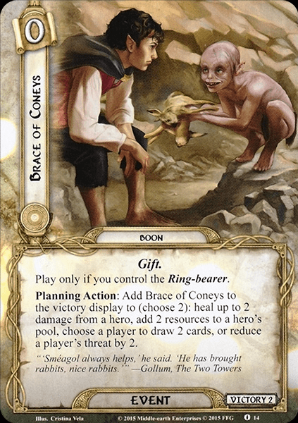 If you play saga mode, you have an additional setup step: Either you add 1 resource to each of your hero’s resource pool (letting you play a pseudo-easy mode!), or you shuffle a boon called “A brace of Coneys” into your deck. A Brace of Coneys costs 0 and has a victory point value of 2, meaning that it goes to the victory display after you play it. You can only play it if you control the ring-bearer. As a planning action, you can add it to the victory display to pick two of the following options: heal up to 2 damage from a hero, add 2 resources to a hero’s pool, choose a player to draw 2 cards, or reduce a player’s threat by 2. A nice versatile bonus, but at the expense of hitting the ground running with 3 extra resources. I tend to go for the boon because I love the flavor. But make no mistake, in saga mode, you want as few enemies as possible from reaching the black gate. So if you think you can achieve that goal more efficiently by taking the resources, this might be a good option. You WILL regret letting enemies reach The Black Gate in saga mode… More about this is below. Additionally, you remove all Burdens from the deck with the Helm’s Deep and The Road to Isengard symbols. These are not relevant for Frodo.