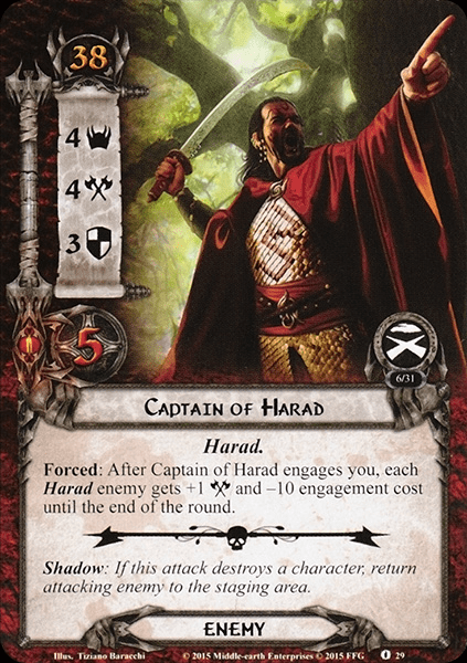 - The second enemy is the Captain of Harad, a mini-boss that can severely mess up your plans. On normal, you include three copies, which means you are very likely to see him. 4 threat can really mess up your plans and keep you from placing progress and from clearing locations. He has a printed attack power of 4, 3 defense, and 5 hit points. For that reason, it is very unlikely that you can deal with him and the enemy from the Cross-roads the same turn in true solo. He has a high engagement cost of 38, meaning that you often will have the option to let him go to The Black Gate by leaving him in the staging area. I have often used that possibility. On the turn you engage him, Harad enemies get +1 attack and -10 engagement cost, which might deal damage to your defender if the attacker is sufficiently strong. The -10 engagement matters more in multiplayer, where it can cause a surprise engagement to a player you did not expect. Since the reduced engagement cost and attack bonus only trigger upon engagement, he is a prime target for a Forest Snare. I have often cancelled this enemy with Black Riders Frodo in the hope of getting a location. I am usually very happy to see him as a shadow card because that means I won’t have to face him during the questing and combat. However, his shadow ability can be very punishing and potentially cost you the game: If the attack destroys a character, return the enemy to the staging area. This will likely lead to the enemy in question going to The Black Gate. So think about this card when you use chump blockers. I have rarely done so because I feel like chump blockers are too slow for this scenario. Proceed with caution.