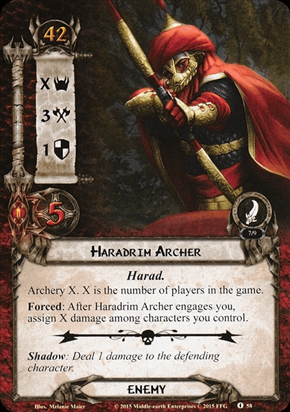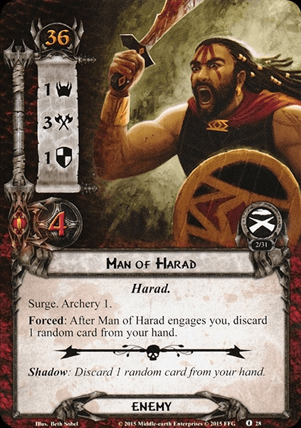 - The Man of Harad is a weenie enemy that you normally wouldn’t mind too much. Four copies in the encounter deck means that you will see him fairly often. Strength wise, he reminds me a little bit of the smaller goblin enemies we saw around the Dwarrowdelf cycle. 1 threat, 3 attack, 1 defense, and 4 health makes him a manageable threat, where you might make his attacks undefended, and a well-buffed attacker can take him out in one hit. An engagement cost of 36 means that you could leave him in the staging area early in the game. However, on this Journey to the Cross-roads, so you know that is not really an option. To have this enemy be one of your foes that goes on to the black gate can be catastrophic – it severely limits your wiggle room. At higher player counts, this might be ok, but in true solo, he might require you to block his attack, which easily can lead to a situation where you suddenly don’t have enough attack power to deal with the archer or the soldier you also were engaged with. Additionally, he has Archery 1 and Surges. Yes, you might get a little Surge train, where you suddenly reveal multiple copies of this guy, followed by the enemy we will discuss below. And as if that wasn’t enough: When you engage him, you discard a random card from your hand. That Feint you were saving for the Oliphaunt? That’s trash now. I find this enemy so unpredictable and hard to handle that I often end up canceling the card with Black Riders Frodo and drawing a new one. Occasionally you get a treachery that makes things worse, or you just draw a different copy because there are so many copies. But to get this enemy out of the way is often worth it. If your group can handle him in four-player, he is an easier threat to manage. If you get him as a shadow card, you must also discard a random card from your hand. This can be a very steep price if you throw out something useful, but I’m often very happy to see him as a shadow card anyways.