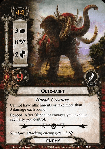 - Have a plan for how you will deal with the Oliphaunts. Will you let them through? In that case, how many? And how do you plan to deal with their attack and engage abilities? Ideally, you want to deal with the Haradrim on the same turn as they engage you. You do not have that luxury with the Oliphaunt. They truly are the Oliphaunts in the room. I will not apologize for that joke.