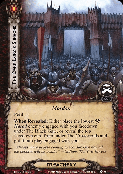 - The Dark Lord’s Summons is a nasty treachery that can cost you the game if you draw it early. It has Peril, so you are on your own for that one! When revealed, you must either place the Harad enemy with the lowest attack power under the Black Gate (booooh!) or reveal the top card from under the Cross-Roads and put the enemy into play engaged with you. There is no better way to get a surprise Oliphaunt. At lower player counts, this can actually come with a slight benefit – the enemy does not go to the staging area, so that you will have no additional threat added to the staging area for the round. But now you have two enemies from the Cross-Roads deck to deal with. In true solo, you will likely have to let one of them go. I’ve often found that this card causes me to take an Oliphaunt I have chipped away at and put it under the Black Gate. If you have cancellation options, it might be worth using them here. If it is late game, you are all set up, and you are feeling lucky, then go and take the enemy! The card has no shadow effect and comes in three copies.