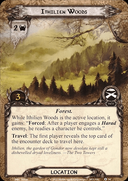 - Ithilien Woods is a 2 threat location with 3 quest points and comes with two copies. When Ithilien Woods is the active location, it gains Forced: Whenever a player engages a Harad enemy, they ready a character they control. This is a niche effect that lets you quest a little harder if you have a character with both high will and high combat/defense. Suddenly you can take advantage of this character in both questing and combat. However, the travel cost of this location makes it a bit deceptive and can lead to a situation that backfires. To travel there, you must reveal a card from the encounter deck, and by now, we know that this can be bad news. You might just get another location to replace it or a treachery that you can deal with easily. But you might also get a nasty treachery (as we will discuss in a moment) or a Surge train with Men of Harad and the Captains that you are unable to deal with. Try to bypass the travel cost if you can with Thror’s Map or The Hidden Way, or just quest over the 2 threat. Alternatively, use Scrying effects to know what it will bring out, so you can make an informed decision on whether it is worth it. It has no shadow effect.