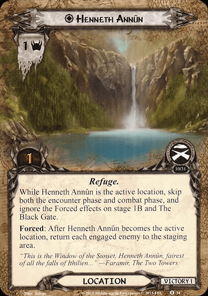 - Henneth Annûn is something as unusual as a beneficial location. The encounter deck has a single copy and contributes 1 threat, making it a very soft blow in the round where it appears. It is also a highly thematic location, representing the location where the rangers hide out away from the Harad soldiers. If you can travel there, things get pretty wild: While Henneth Annûn is the active location, you skip both the Encounter phase and the combat phase, and you ignore the Forced effect on BOTH Stage 1B and the black gate! When Henneth Annûn becomes the active location, you return each engaged enemy to the Staging area. This, of course, means that you need to make time when you travel there. If you have been chipping away at an oliphaunt, you don’t want to send it back to the staging area and eat the engagement Forced effect one more time. It is also a bit of a non-bo with Forest Snare because it will return any engaged enemies to the staging area, and you will have to eat the engagement effect again. But if you have cleared out your enemies and you aren’t location locked, this is a prime opportunity to take a breather, build up your board state and enjoy a round without combat. This is not without risks, of course. You do not skip the quest phase, so you might build up a conga line of Men of Harad and the Captain, meaning you have to face some serious combat once you clear it. And you will likely clear it the minute you quest successfully because it only requires a single progress to clear. If you use scrying tricks, you might be able to break even and stall for a few turns, but I won’t recommend that because of the risk of additional enemies. But I have found this to be a very helpful step on the way to succeed in this quest. Once it is cleared, you are ready to take on the enemies and give them hell. Make the most of this location if you are lucky enough to see it. It has no shadow effect.