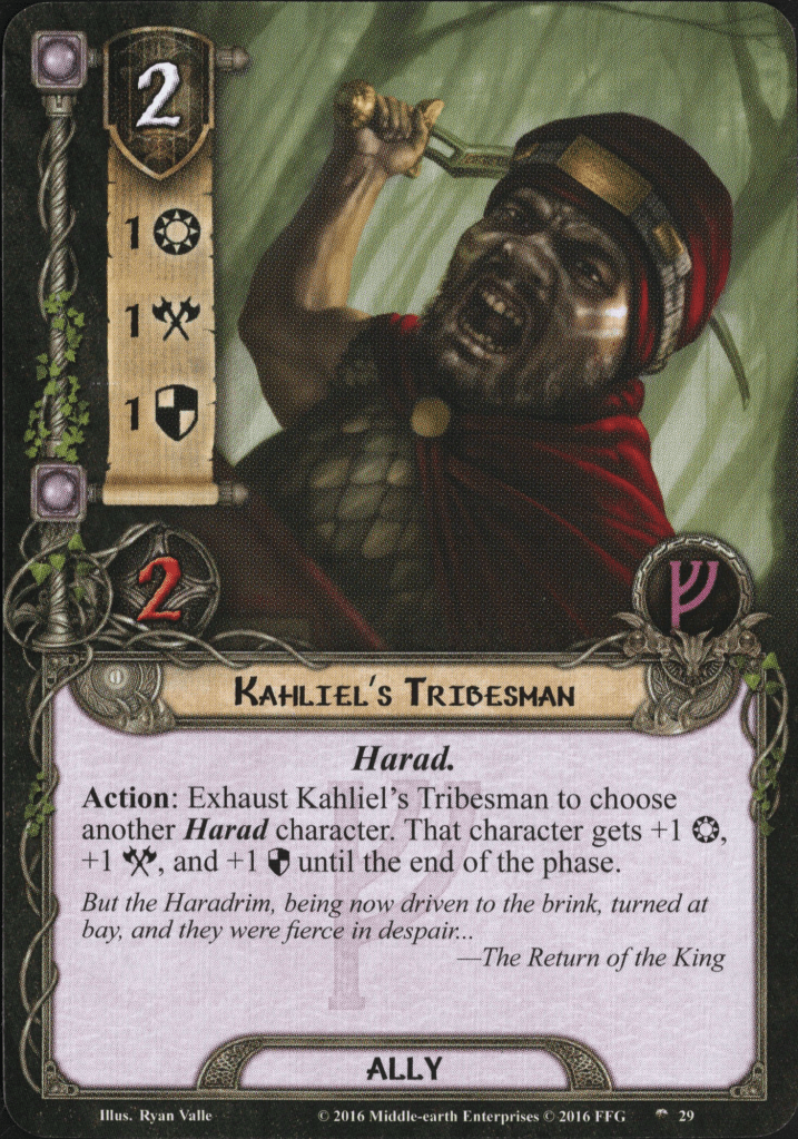 It might almost be a cliché at this point, but the quote above is one of my favorites from the Lord of the Rings books. The enemy is so often depicted as inhumane, faceless, and frightening, but here Sam takes the time to think about the person underneath the helmet. One cannot help but wonder whether Tolkien had a similar experience as a young man at the battle of the Somme, facing the Kaiser’s armies in the trenches. It is therefore only appropriate that our beloved card game really takes the time to show that in spite of their service to Sauron, the Haradrim have a rich culture and are capable of great feats of heroism and kindne… Oh wait, sorry about that; I am getting a call from my editor…
