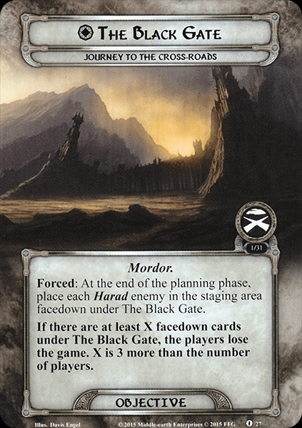 All jokes aside, the quest actually manages to convey the theme of the battle quite well, where Faramir and his rangers try to stop the Haradrim from joining up with Sauron’s forces at the black gate. Because the mission here is so straightforward, the setup for this quest is fairly straightforward as well. The first thing you add to the staging area is the Black Gate. Despite the name, it is not an actual location in this quest but an objective. It has a Forced effect, stating that at the end of the planning phase, all Harad enemies in the staging area are placed under the Black Gate. If there are at least X enemies at the Black Gate, where X is the number of players in the game +3, you lose the game. As mentioned above, this represents that you failed to stop the Haradrim from joining forces with Sauron. Do it too many times, and you lose the game. But surely, this is only a problem if you draw enemies from the encounter deck, right? Well, this scenario has a trick up its sleeve…