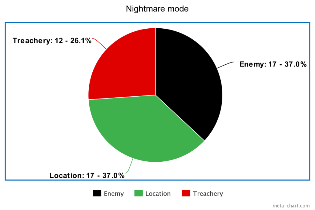 - The Shadow effect percentage drops significantly from the Normal mode by almost 10%. Only 46% of the cards in Nightmare mode have a shadow effect.