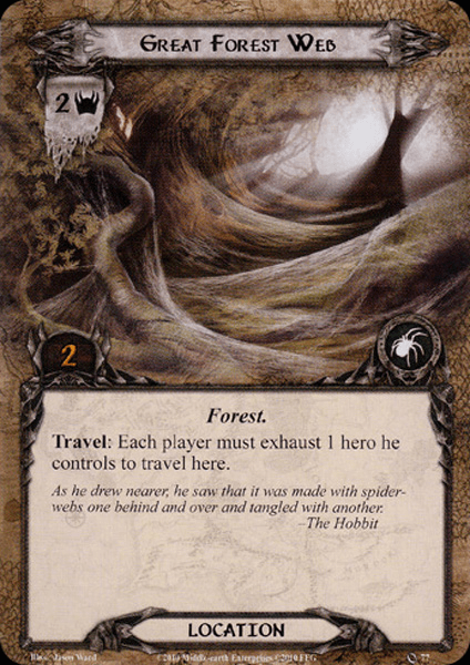 - Great Forest Web: Our first location on this list is the Great Forest Web. This location sounds pretty bad, but when you look at the stats, you see that it isn’t too terrible. 2 threat and 2 quest points are pretty average for this quest and low when comparing it to other scenarios. The biggest problem with the Web is its travel cost. Each player must exhaust a hero in order to travel here. If any player cannot exhaust a hero, then the players aren’t able to travel here, and they must instead go somewhere else if able. This location is usually left in the staging area, as it is not worth traveling to. You reduce the threat in the staging area by 2 in exchange for needing 2 more progress next round to clear it. The cost of exhausting a hero per player is usually too high, except if each player either has a way to ready their hero or doesn’t need their hero for the rest of the round. This can happen if no enemies were revealed that round, in which case the Web can make for a proper destination during the travel phase. It is recommended to just clear the Web in the staging area with the use of player card effects. 2 quest points are easy to overcome with effects like Asfaloth and Evening Star, and even effects that place just 1 progress are already halfway there.