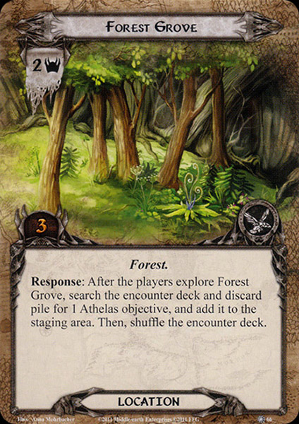 - Forest Grove: The only new location you can encounter from the deck is actually a beneficial one. Forest Grove lets the players find an Athelas objective once they explore the location. They add the objective to the staging area. Keep in mind that as the objective was not revealed from the encounter deck, the Guarded keyword does not trigger. This allows you to get some very easy Athelas on the table quickly! This location is always worth it to travel to, as more Athelas can be found, even when it comes up as a Shadow card on an enemy. There are 4 copies of this location to pair the 4 objectives in the deck. This doubles the chances of you finding an objective, so be on the lookout for this card. Note that you even get to find the Athelas if you explore the grove in the staging area, so if your progress-placing cards are working well, you can just travel elsewhere to get rid of more threat. Also, make sure to take out Athelas objectives from the encounter discard pile through this effect if you can. The ones still in the encounter deck can still be revealed naturally, while the ones in the encounter discard pile won’t be reshuffled for a while.