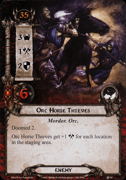 - Orc Horse Thieves: The only new enemy in the encounter deck is not one you’ll see a lot of but will require some attention if they are revealed. At 3 threat and with Doomed 2, the Horse Thieves make quite the entrance. The threat increase usually isn’t a big deal, as the quest does not have a lot of threat-raising abilities outside of this one and Pursued by Shadow. However, if this effect puts you above 35 threat, you might want to consider reducing it soon before you fall prey to Evil Storm or certain enemies. The Horse Thieves are one of the enemies with an engagement cost of 35, but you usually want to engage them a bit earlier. This removes their 3 threat from the staging area, plus you likely have enough characters ready for combat anyways. The Horse Thieves have an ability that increases their attack stat for each location in the staging area. If you have been travelling constantly and clearing locations in the staging area, then they will likely not get past 3-4 attack. However, for higher player counts, you might face these enemies with a lot higher attack stat if the players are currently in location lock. That can get pretty dangerous, at which point I would suggest you cancel their attack with a Feint. In most cases, though, their attack should be easy to deal with. Attacking back is sometimes more difficult than you might think at first. With 2 defence and 6 hitpoints, you will need a lot of attack to get rid of these enemies. And if your deck is not particularly focused on attacking, this might take a long time. Don’t worry, though. If you are questing well and clearing locations, you can definitely afford to have this enemy engaged with you for a few turns. Hobbit decks might even get a nice boost out of it since they will be engaged with an enemy that has a decently high engagement cost.
