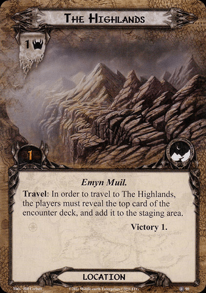 - The Highlands: This is by far the weakest location in the encounter deck, at just 1 threat and 1 quest point required to defeat it. You are, in turn, only rewarded with a single victory point, but that’s still 5% of your required total. The single point of progress required to clear this location makes it very easy to clear in the staging area or even before that! Warden of Arnor is not a common card used in decks, but it could clear this location as soon as it is revealed. There is also a host of other effects that can be used to clear this location without traveling to it, so you really do not have to worry too much about this one. However, if you do decide to travel here because the other destinations aren’t worth it, you do have a travel cost. You have to reveal the top card of the encounter deck to travel here. This can reveal another location or get you an enemy to face in the combat phase. Treacheries like Rockslide are also good to get here since characters are no longer considered to be questing. But in most cases, you do not have to worry about any of that if you just leave this location in the staging area for a Northern Tracker to pick up the next round.