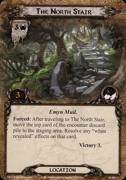 - The North Stair: Another 3 victory point location, though this one only has 3 threat, but does require 3 progress to clear. This makes it a little more resistant against location control cards, but any dedicated deck can make short work of this location. Still, this is a location I do find myself travelling to more often than others. This does depend on the situation since you can see which card is on the top of the encounter discard pile. Once The North Stair becomes the active location, that card is moved back to the staging area, and any When Revealed effects are triggered. Locations are rare to get on the top of the deck since most are sent to the victory display once cleared. But you can still get some locations worth Victory Points if any were dealt as shadow cards. Treacheries are usually fine, with some exceptions. Most treacheries can often do next to nothing, like Rockslide (no longer the quest phase), Slick Footing (if there’s no progress on any cards), Evil Storm/Treacherous Fog (if no player is above 35 threat), and Driven by Shadow (increased threat on cards doesn’t matter). The other treacheries in the deck will do something, but since you can see which card is on top of the discard pile, you can time when you want to travel here. Enemies on top of the discard pile will also usually be a fine card to return to the staging area. They are not that difficult in this scenario, and in lower player counts, you might actually like to see an enemy for once. The North Stair itself is not that interesting after this Forced effect is triggered. Clear it for 3 points, and try to avoid having to return it to the staging area from Impassable Chasm, lest you have to trigger the Forced effect again next turn.