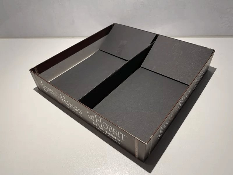 The more cards you cram into a box, the more they’ll stand up and the higher the lid will sit. For now, I keep the rule sheets in the deluxe boxes, just on top of the cards, and it does add to the height. I prefer no more than 400 cards per box; else, it stands up too high. Note that the slope at which you store the cards is quite shallow if you don’t have as many cards in the box, allowing the lid to close easier. The more cards you add to the box, the taller you will have to stand the cards up. That means that at full capacity, the cards will be standing up nearly vertical, making it more difficult to close the box and put the belt on. By widening the belt, you can allow it to slide over the closed box easier and keep everything nicely in place.
