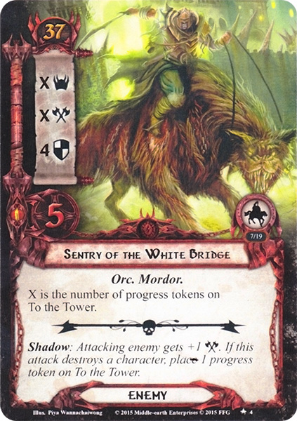 - Sentry of the White Bridge: The final new enemy in this Nightmare scenario is the Sentry of the White Bridge. It gets its name from the unique location at the end of this scenario because it too scales with the number of progress tokens on the To the Tower objective. Its threat and attack strength will steadily increase during the game, making this a relatively harmless enemy at the start of the game but potentially an 8-9 attack/threat enemy by the end. Blanking his textbox is a great counter to this scaling, though, as Revealed in Wrath can make this enemy attack for 0 or contribute 0 threat to the total in the staging area. Radagast’s Cunning can also do this. While engaged, the Sentry will be difficult to defeat thanks to the 4 defence and 5 hitpoints. It’s not the only sturdy enemy in the encounter deck, so if you are playing multiplayer, this enemy is better to be engaged by a player who does not have to deal with the Captain at your stage. Another good trick against this enemy is to use a Forest Snare on it. If you do that, then his inflated stats do not matter for the rest of the game. There are also only 2 copies of this enemy out there, so if you can trap both this way, they will do nothing from that point on to harm you.