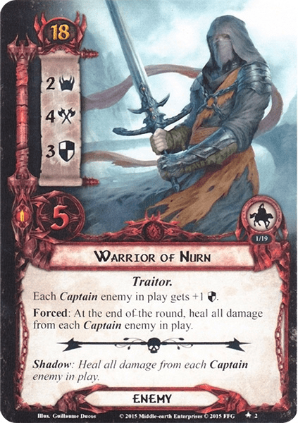 - Warrior of Nurn: Looks like Alcaron got some support from Nurn in this Nightmare version of the game. This enemy serves as a buff to each Captain enemy by providing them with +1 defence and a heal at the end of each round. The defence will stack with all copies of this Traitor enemy, so you can potentially get +3 defence on enemies. The more annoying part is that at the end of each round, all damage gets healed from each Captain enemy in play. For Alcaron and Murzag, this is not a huge issue since you can try to hit them hard in one attack, hopefully killing them in one go. But the Nazgul is protected from this by its textbox, reducing all damage to 1. And if the Warrior of Nurn is removing all damage at the end of each turn, then you will need to find a way to deal 5 different instances of damage to the Nazgul in a single turn while also dealing with an increased defence. So it is usually better at that point to turn your attention on the Warrior of Nurn and kill him before dealing with the Captain enemy at your stage. Though that is easier said than done. The Warrior will engage early, at 18 engagement cost. It attacks for 4, putting pressure on players early on to be able to defend him as well as Murzag. Killing the Warrior is going to take some effort, as you will need to penetrate 3 defence and deal 5 damage. This is also too much for direct damage to deal with, though it can help to soften him up a little.