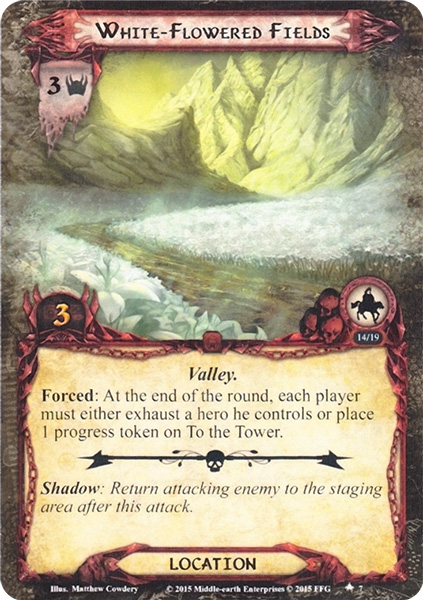 - White-flowered Fields: This is another location that you do not want to have in play for a very long time. The title of the card might sound wonderful compared to the others, but for those of you who have read the chapter on the Morgul Vale, you’ll know that these flowers aren’t all that great. While this location is in play (in the staging area or as the active location), each player must either exhaust a hero they control or place a progress token on To The Tower at the end of each round. This is done for each copy of the location, though there are only 2 in the deck. But the fact that you cannot avoid this Forced effect when the location is active makes it quite tricky, and you will likely have to deal with the effect at least once during your playthrough. In nearly all cases, I would advise exhausting a hero. If each player were to place a progress on To the Tower, it would be game-over in a few turns. Instead, you can equip your heroes with some readying attachments and be fine. This also triggers after the Refresh Phase, so all heroes will be ready for this effect (except perhaps Gwaihir). In order to avoid having to trigger this Forced effect, I would suggest finding a way to clear the location from the staging area. You can also use Thror’s Key to blank one of the copies so that you just have a generic location in the staging area with 3 threat that you do not have to travel to unless you have no other option.