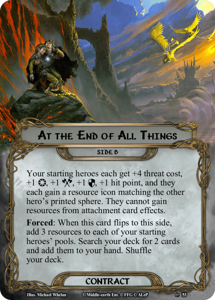 Side B has some of the same text as side A to maintain the buffs on your starting heroes. They keep their +1 to all stats and +4 to their starting threat cost. This is important in case you have a Lore Aragorn on the table and would want to lower your threat. You lower it to the cost of the two heroes combined plus the 8 threat of the contract. The heroes also maintain their sphere match, and they can still not gain resources from attachment card effects. The notable thing missing from this list is that the heroes could not be healed on the A-side of the contract. That is now gone, and you are free to heal them however you like.