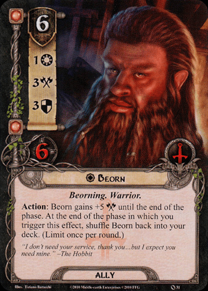 Sadly, the amazing feeling of turning over the contract comes with a few downsides as well. The lack of action advantage hurts, especially in the early game. Yes, you get the ability to ready a hero, but only once per round. You will need either built-in readying in your heroes (Boromir, Leadership Aragorn, Quickbeam) or a readying attachment in your opening hand (Unexpected Courage, Snowmane, Light of Valinor, etc.). The more readying you bring, the more use you can make of your improved stats, which allows you to have a lot of fun with your heroes. The lack of action advantage might also be felt in the inability to spam allies since you are restricted to two resources per round and have to ensure that your heroes are set up first. This can make the early game quite dangerous, as enough low-engagement cost enemies can engage you and force you to take undefended attacks. A deck like this is easily overwhelmed against the wrong quest.