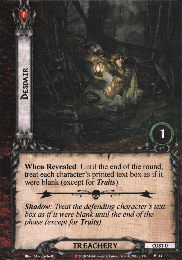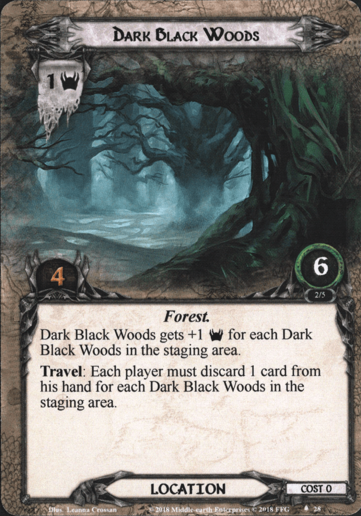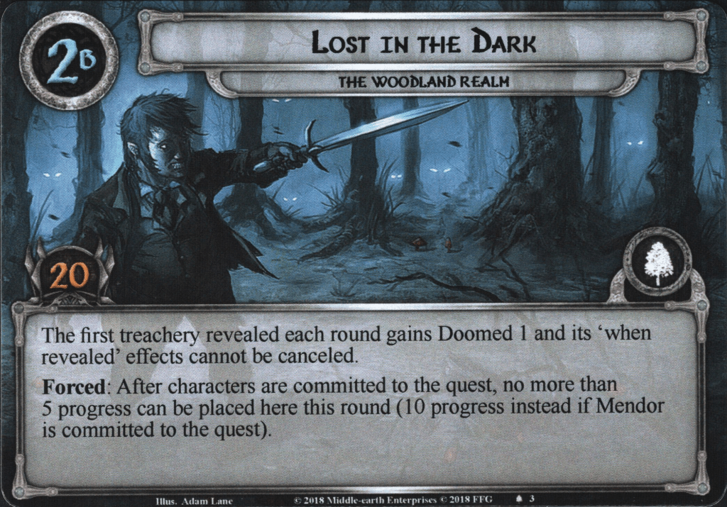 Contrary to the quest card in Passage through Mirkwood, this one does not focus on enemies but on locations. It is easy to get lost in Mirkwood, and with this quest card providing support to locations, it can make a location lock easier to accomplish. During this stage, progress cannot be placed on locations in the staging area. If there is already progress on locations, that can remain, but no new progress is added. This prevents the players from clearing locations in the staging area, though they are still able to place progress on any active location.