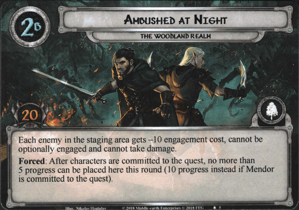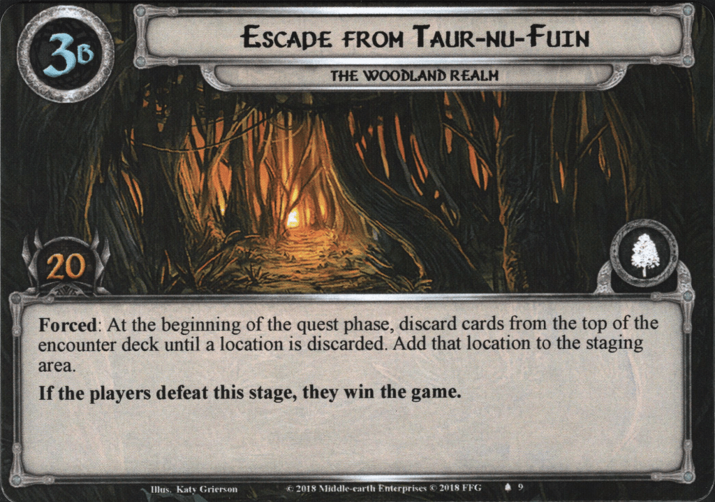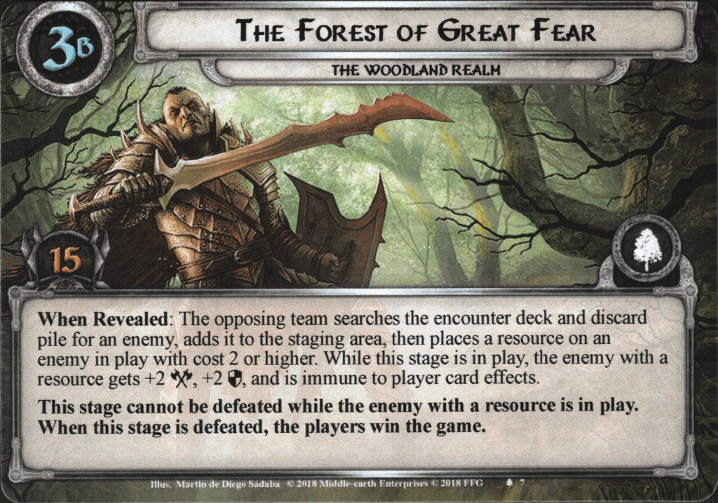 Continuing the trend of locations, this quest stage is geared towards getting more locations in the staging area to bump up the threat there. It has the highest printed quest points out of the three stages, though this can be eclipsed by To the Elvenking’s Halls. The 20 progress could all be placed in one turn, though, since there is no longer a limit on the amount of progress you can place in one turn. But to prevent players from questing too hard, there is a Forced effect that triggers at the beginning of the quest phase.