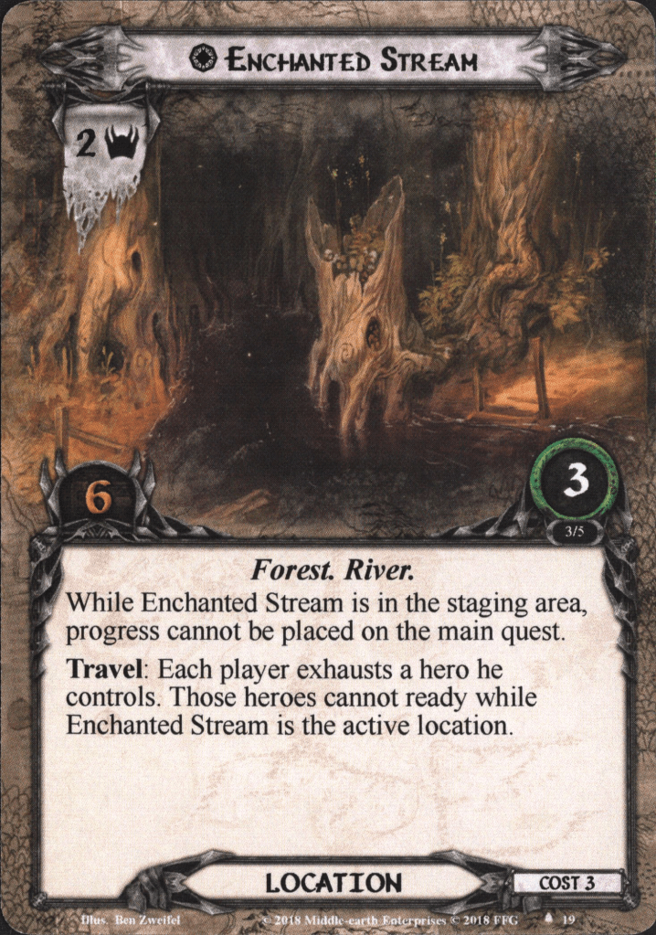 Before players commit characters to the quest, they are forced to discard cards from the top of the encounter deck until a location is discarded. That location then gets added to the staging area. This is worse in true solo since you will have to overcome twice the number of encounter cards per turn. In higher player counts, this is more manageable, especially if you have a player who has been churning out willpower all game. This Forced effect is sure to hit, though, as it will reset the encounter deck if it is empty. The absolute worst card to hit for this effect is the Enchanted Stream, which prevents progress from being placed on the main quest until the location is explored. Traveling here also comes at a pretty hefty cost of your heroes being constantly exhausted. But aside from this location, there isn’t much stopping you from powering through this quest. Once 20 progress has been made, you automatically win. Because of that, I feel that this is the weaker one of the three stages 3B.