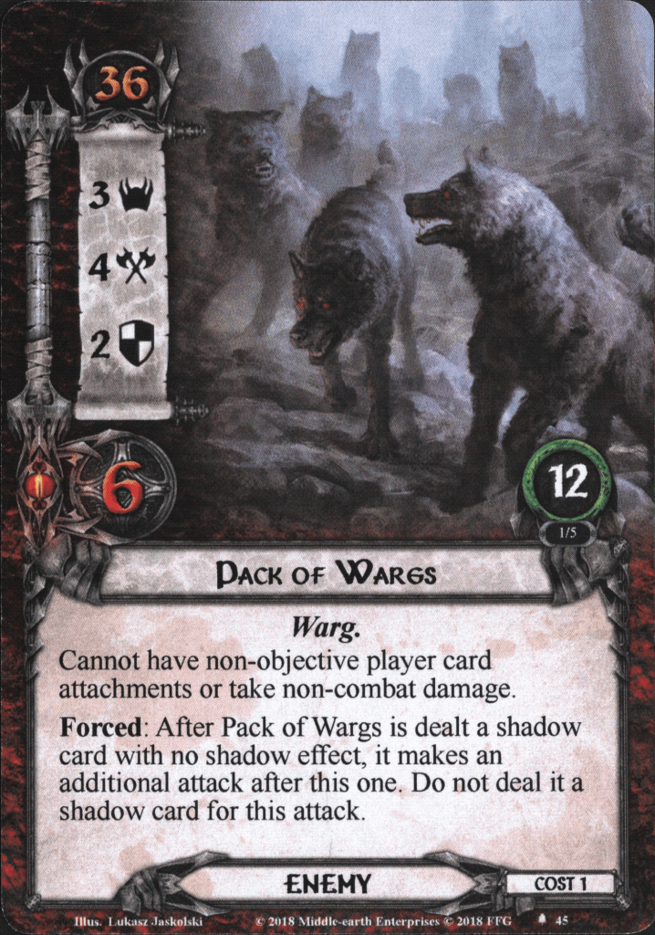I label Creatures as the third enemy synergy you can go for, as they do actually synergize well in this set. They all focus on punishing your opponents if their shadow card does not have a shadow effect. While this would otherwise be deemed a good thing, it can now trigger additional attacks and enemies returning to the staging area. This synergy is found in packs 6, 11, and 12. It does not include as many cards as other synergies and can thus be added to pad out your encounter deck a little bit more if you are not reaching the 10 required enemies in your deck. If you include this synergy in your encounter deck, you may have to look at the ratio of shadow effects on the cards you included. Try to go for cards that do not have a shadow effect so that you optimize your chances of getting the bonus on your enemies.