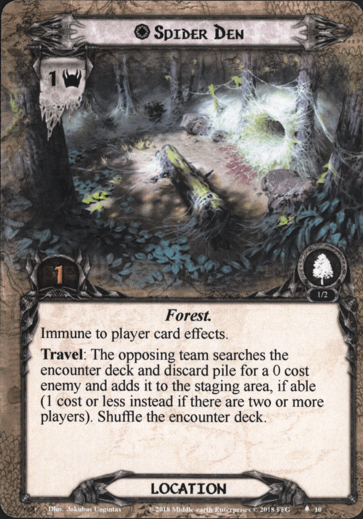 In order to get Mendor, you have to travel to Spider Den first. This might not be something you want to do on turn 1 since you only remove 1 threat from the staging area, and the travel cost is quite bad. The opposing team gets to search the encounter deck and discard pile for a 0-cost enemy and add it to the staging area. If there are two or more players, the enemy can also be a 1-cost enemy, which tends to be stronger. The enemy is only added to the staging area, so When Revealed, effects don’t trigger again. However, this is a mandatory Travel cost since the location is immune to player card effects, meaning you cannot clear it in the staging area or travel here with effects like West Road Traveller, which would ignore the Travel cost. I would suggest going here on turn 2 since you can take the time to clear the staging area a little and build up your deck. If there are more pressing locations to travel to or you are not ready for another enemy, you are free to wait for a few more turns, during which you can put the 10 progress on the main quest. If you are playing competitively, though, know that you do not have an infinite amount of time to spend on this stage, as your opponents will be racing through their quest as well. Once you’ve cleared the Spider Den and have the 10 progress on the main quest, you are free to move to quest card 2A.