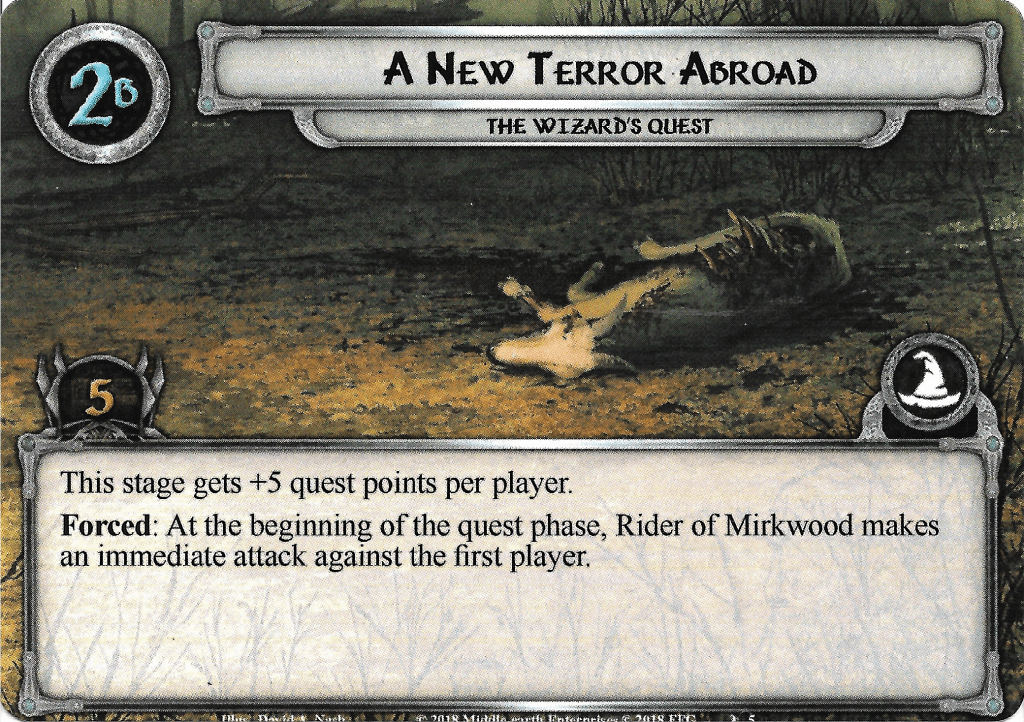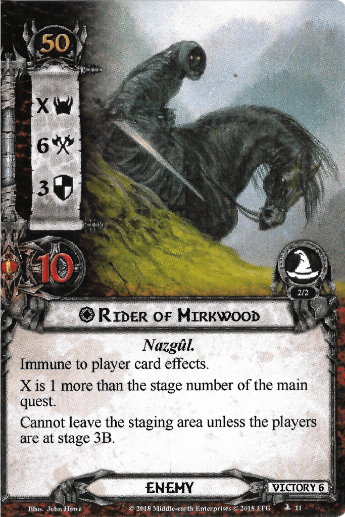 This stage is made a bit more complex by the fact that you can end up with a location lock or stuff like Forest Stream that removes progress from the main quest. This, in turn, can heal the Rider of Mirkwood, as any damage that exceeds the number of progress tokens is healed off. If the players have had a relatively easy time with enemies so far, and have been fighting off a treachery/location-heavy encounter deck, then this stage can force them to have to deal with a pretty strong enemy. Combine this with several mechanics that can push the Rider of Mirkwood back to the staging area after he attacks, and you might have enough progress to clear the stage but can’t nail down the Nazgul.