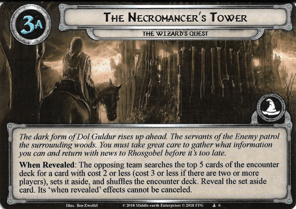 The final option for selecting what quest you have the players face last is the one with the highest number of quest points. Players are not forced into combat with the Rider of Mirkwood for this stage but could engage him to get rid of his 4 threat in the staging area. That will help to make a lot more progress in future turns. Instead, the quest stage makes things difficult by forcing the players first to commit characters to the quest and then discard cards from the top of the encounter deck until a treachery is discarded. That treachery is then revealed, and all bad things are resolved. This can range from dealing damage to committed characters with Necromancer’s Reach to returning all engaged enemies and stacking the staging area with a lot of threat. If the Sorcerer’s Tower is also in the staging area, you have a guaranteed Doomed 1 as well at the start of each quest phase.