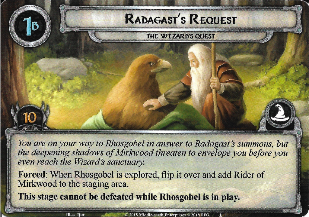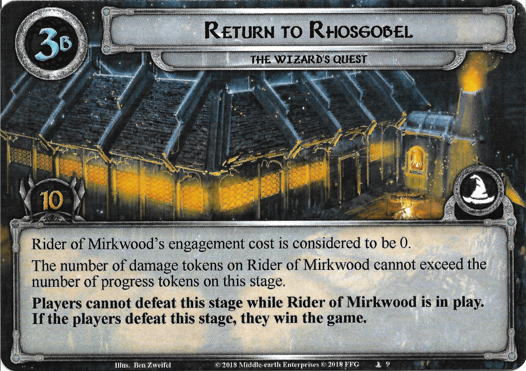 The second option for a quest card 3B is to run back to Radagast. This does require the least amount of progress of all stages but instead forces you to deal with the Rider of Mirkwood. Its engagement cost is reduced to 0, and he gains immunity to more damage than there are progress tokens on the main quest. So you first have to deal with the main quest, placing at least 10 progress on the stage in order to deal enough damage to the Rider in order to kill it. Once the Rider of Mirkwood leaves play, the players win the game.