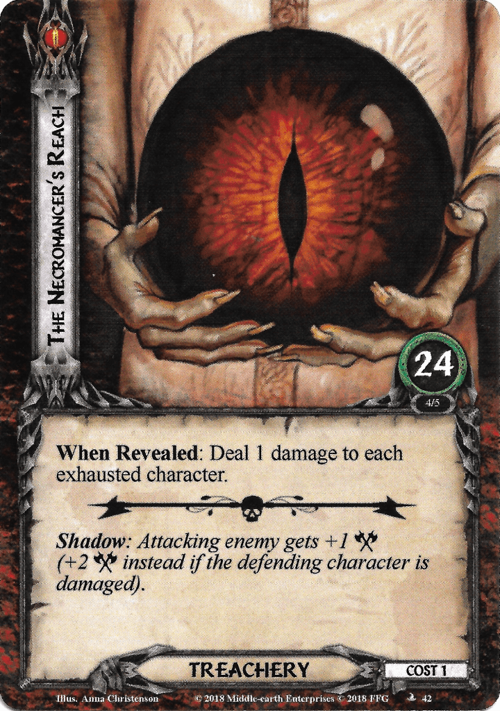 Because of the unpredictability of the treacheries you can include in the encounter deck, I think this might be the worst quest stage to end up at. Sure, you could push hard in order to make 20 progress in a turn or two, but you have to be very careful not to lose your deck to a nasty treachery. Remember that there will be one card per player after that treachery has resolved, making the chance for a double Necromancer’s Reach a lot higher. You also flat-out increase your chances of seeing other nasty treacheries as well. Combine this with a surge-heavy encounter deck, and the players might be overwhelmed by the amount of cards that are revealed at this final stage.